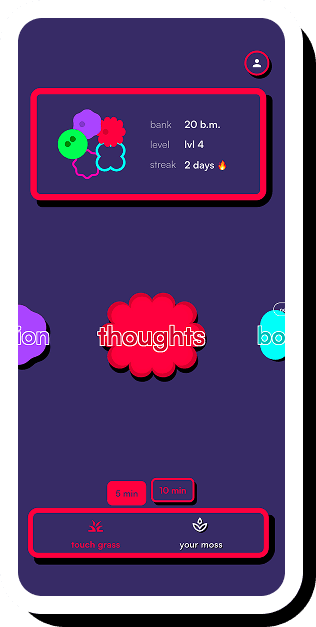 – a daily streak tracker and your boredom bank — minutes of calm you collect